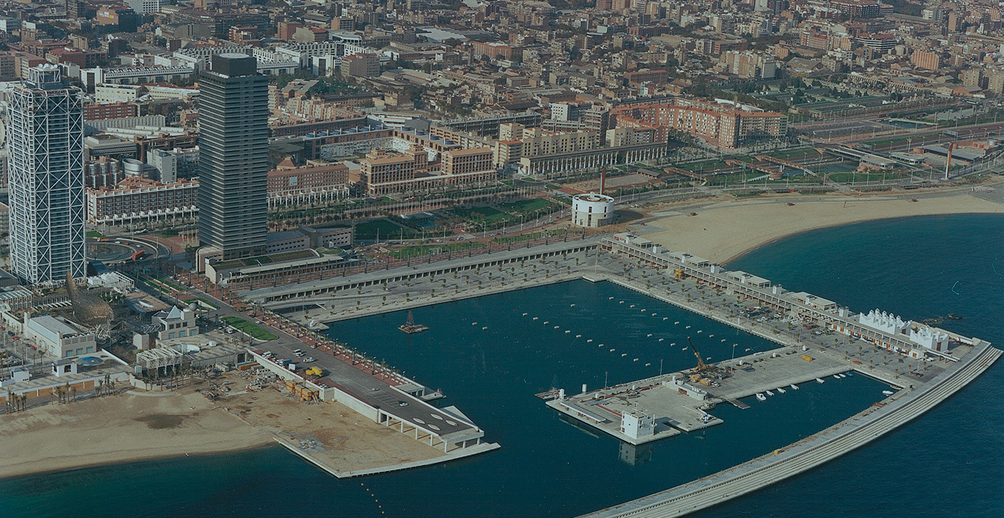 Ejecución del Puerto Olímpico de Barcelona mediante tramos de dique de protección en escollera coronados por un espaldón en forma de grada y la ejecución de un dique de abrigo mediante cajones flotantes y un muelle perimetral.