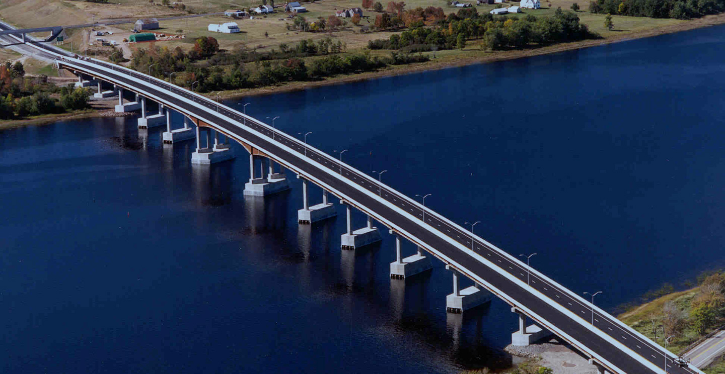 Se construyeron 20 enlaces y 28 pasos elevados, incluyendo dos puentes de singulares de un kilómetro de longitud sobre los ríos Saint John y Jemseg.