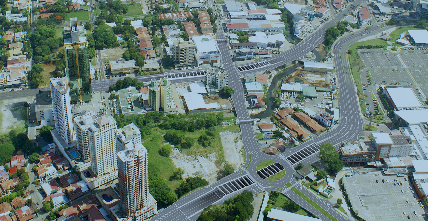 - Tramo 1: Consistió en la transformación de los cruces semaforizados a un nivel, en cruces no semaforizados a tres niveles, mediante la construcción de un paso superior elevado, un paso inferior deprimido y una rotonda en superficie.